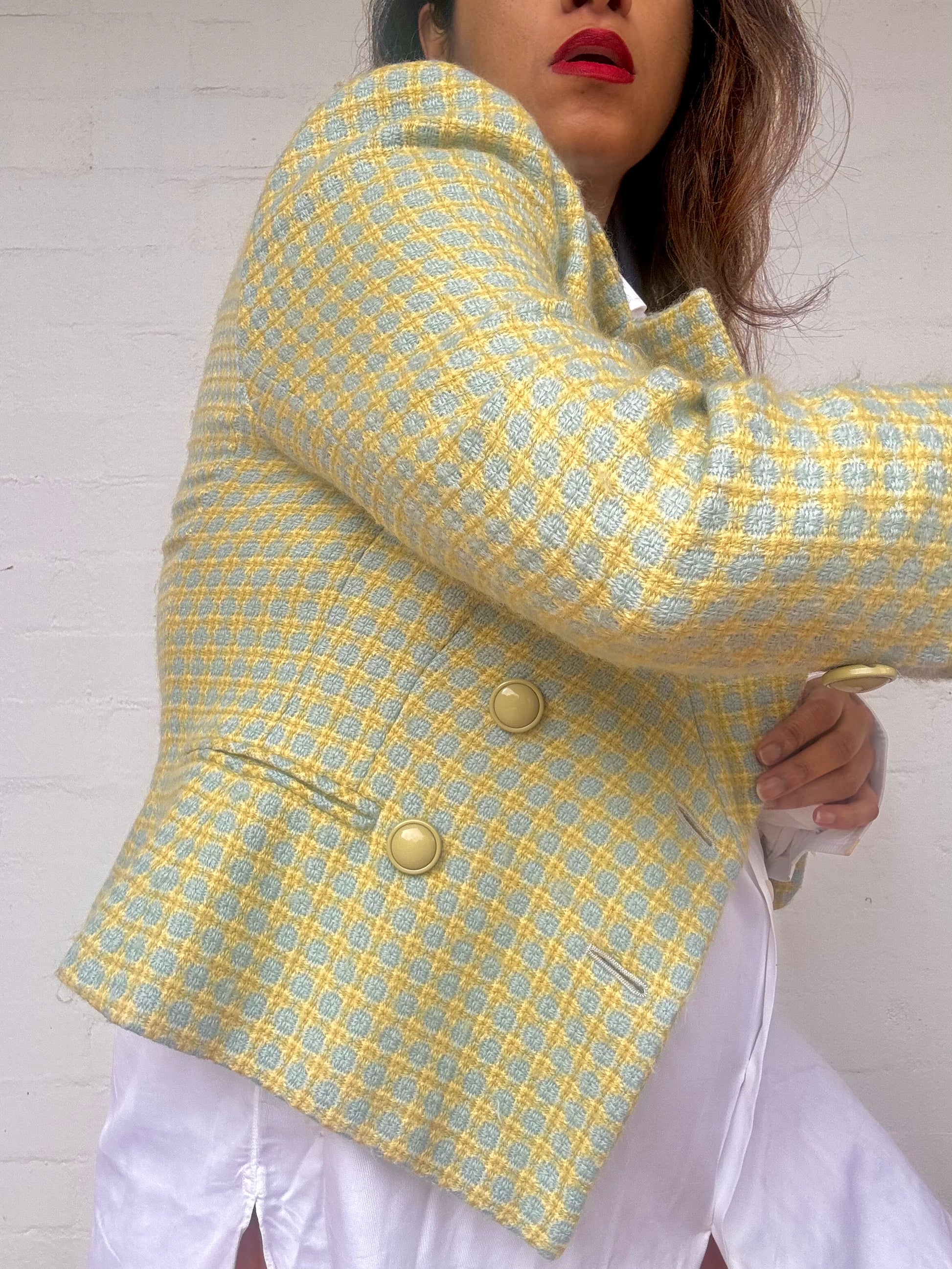 Rare and exquisitely tailored, this vintage Mademoiselle Dior cropped jacket is a true gem of timeless French elegance. Rendered in a soft plaid of pale yellow and blue, it offers a fresh yet refined palette that feels both classic and unique. The structured silhouette is elevated by stunning vintage buttons and a flattering cropped cut that defines the waist with effortless grace. Elegant, feminine, and incredibly hard to find, it’s a standout piece that brings vintage charm to modern styling.