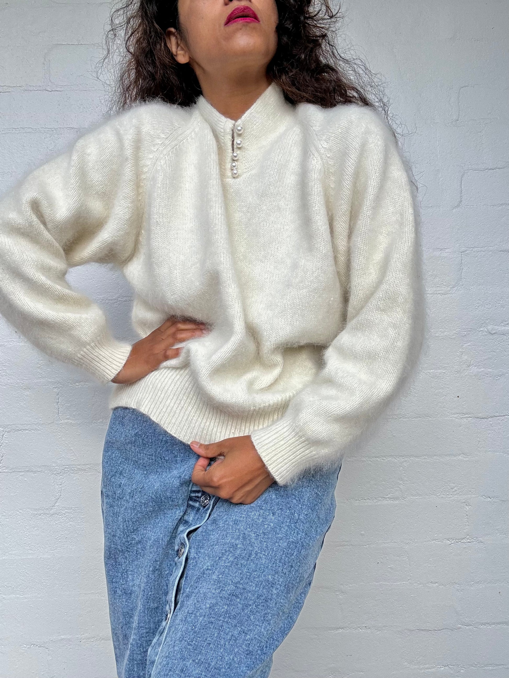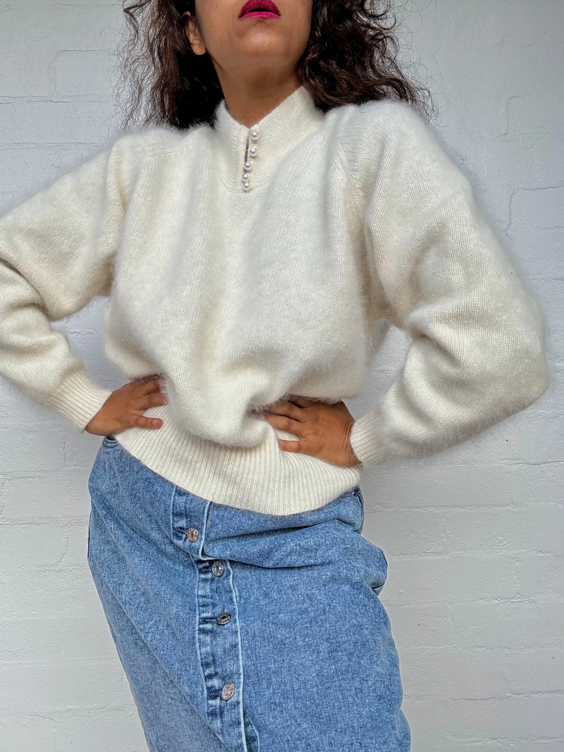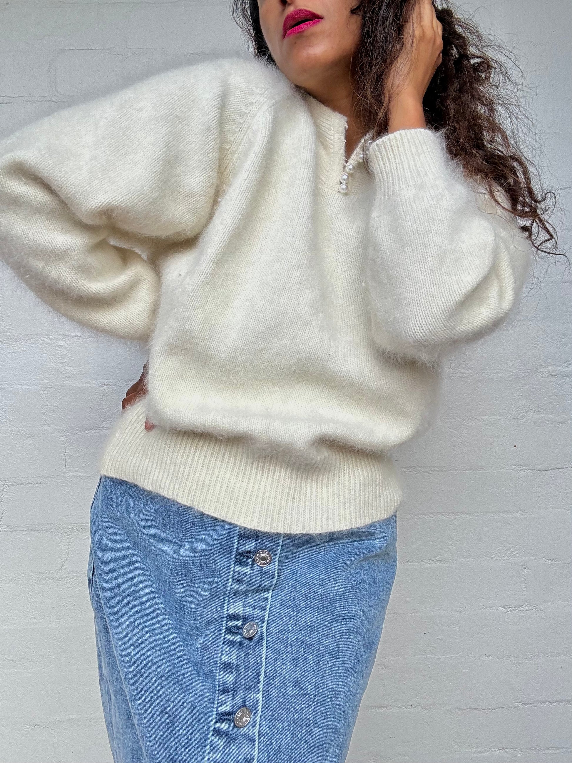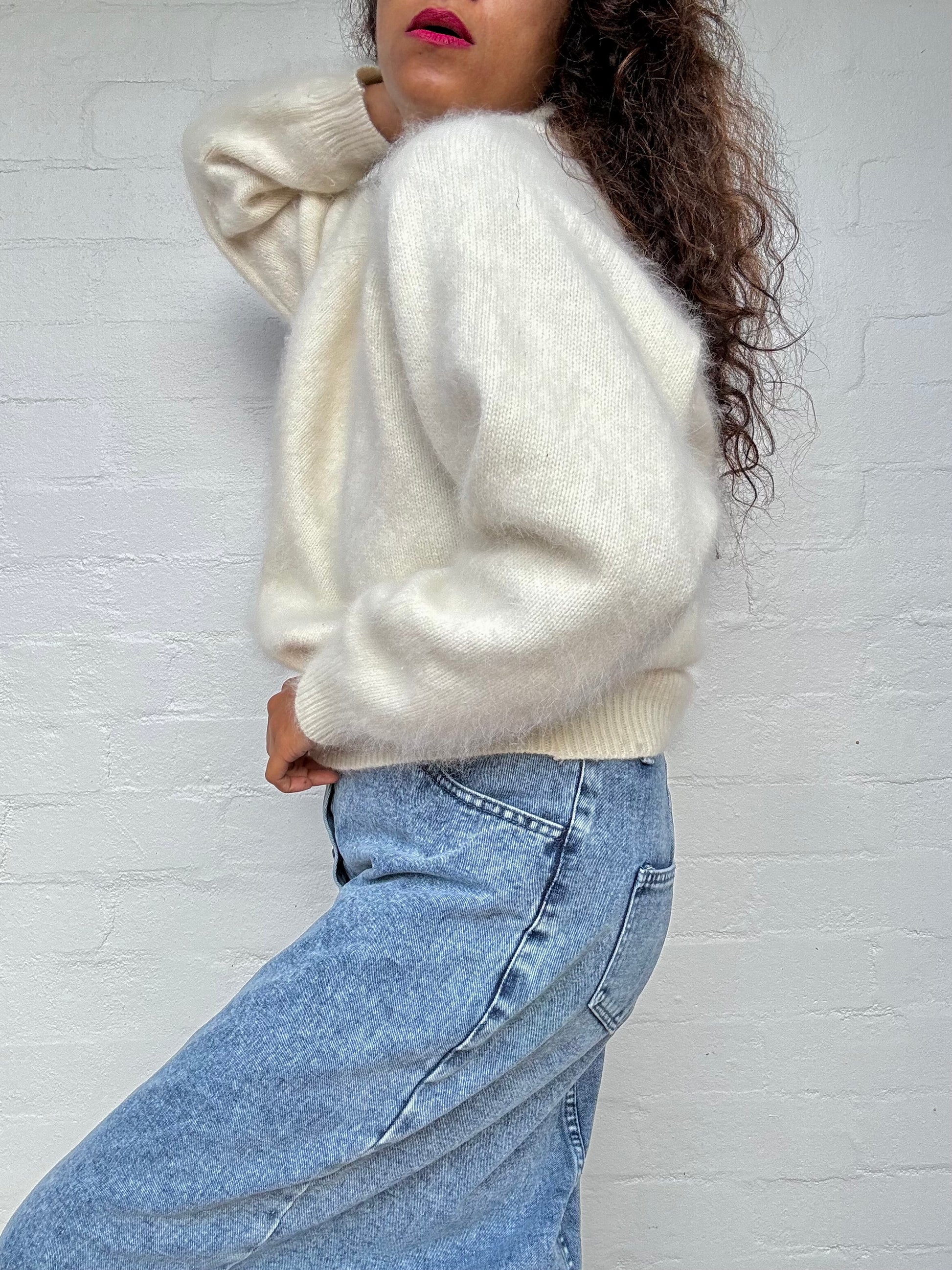 Indulge in the luxurious softness of this Vintage Angora Knit Sweater. This absolutely gorgeous knit is made with high-quality angora from New Zealand. Feels buttery soft Perfect for this season, it can be styled with jeans or a skirt.
