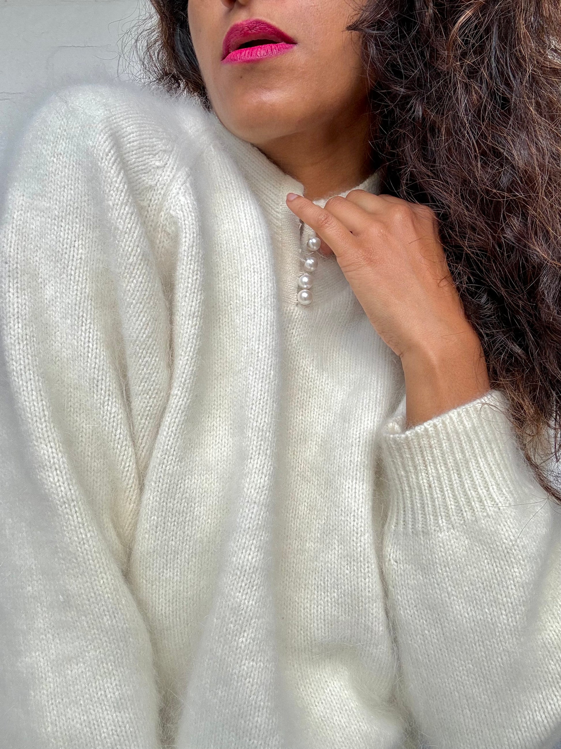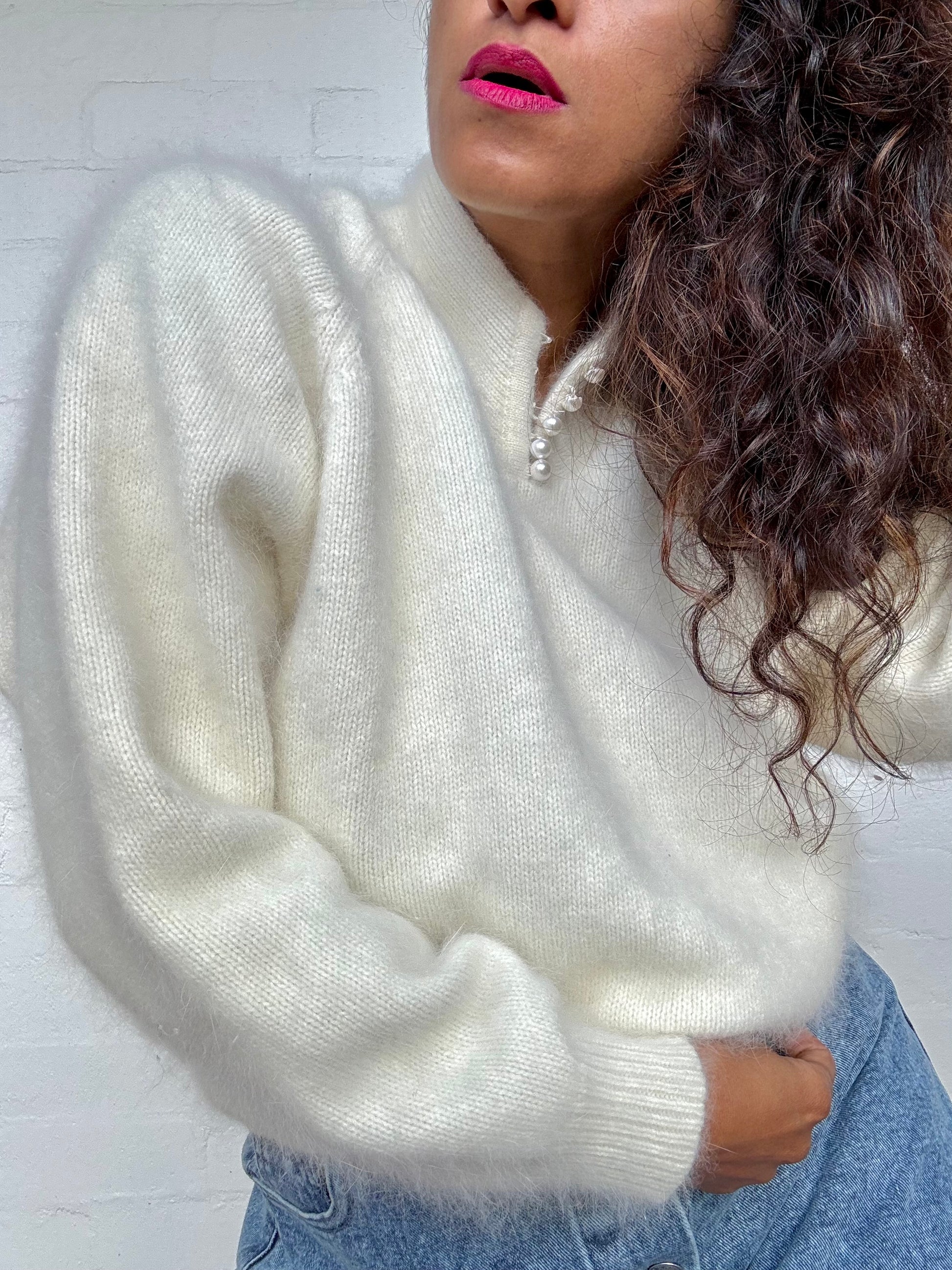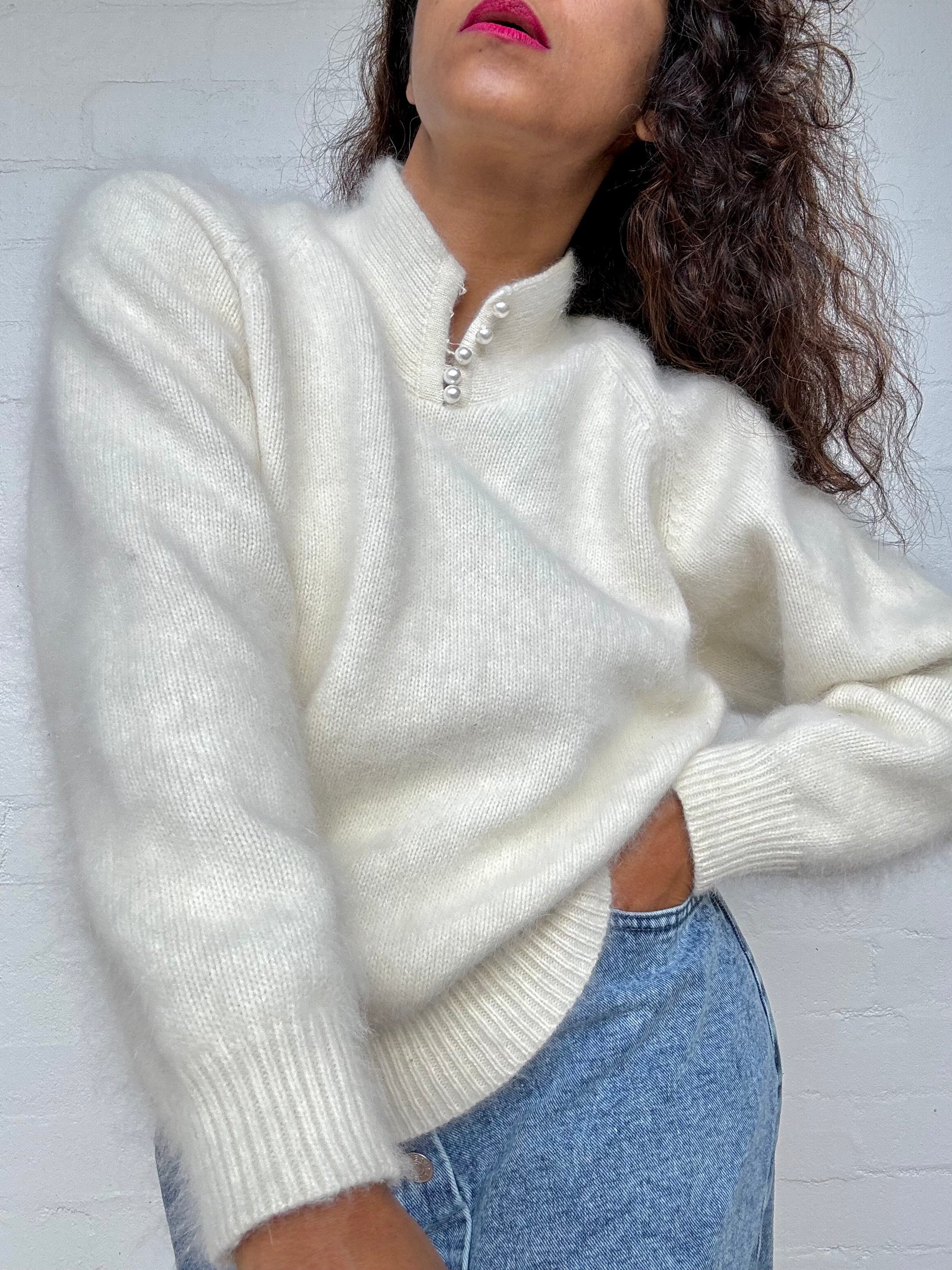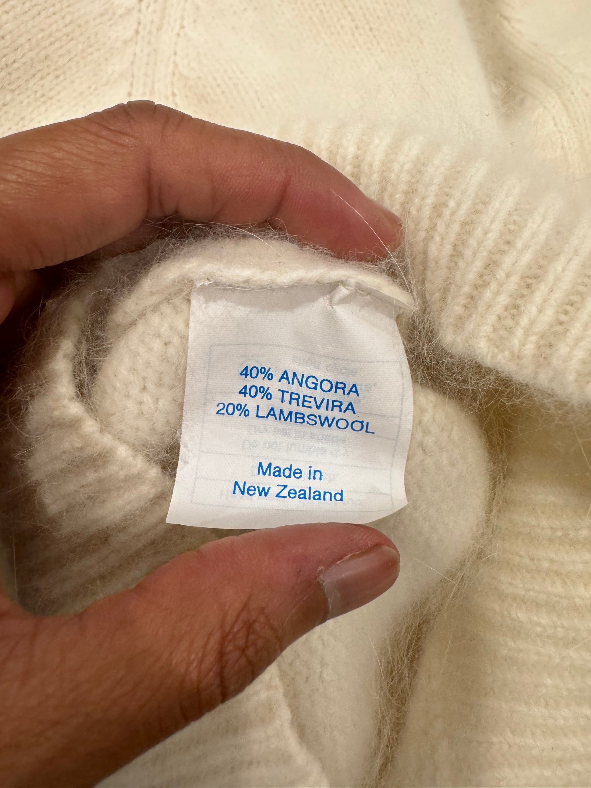Indulge in the luxurious softness of this Vintage Angora Knit Sweater. This absolutely gorgeous knit is made with high-quality angora from New Zealand. Feels buttery soft Perfect for this season, it can be styled with jeans or a skirt.