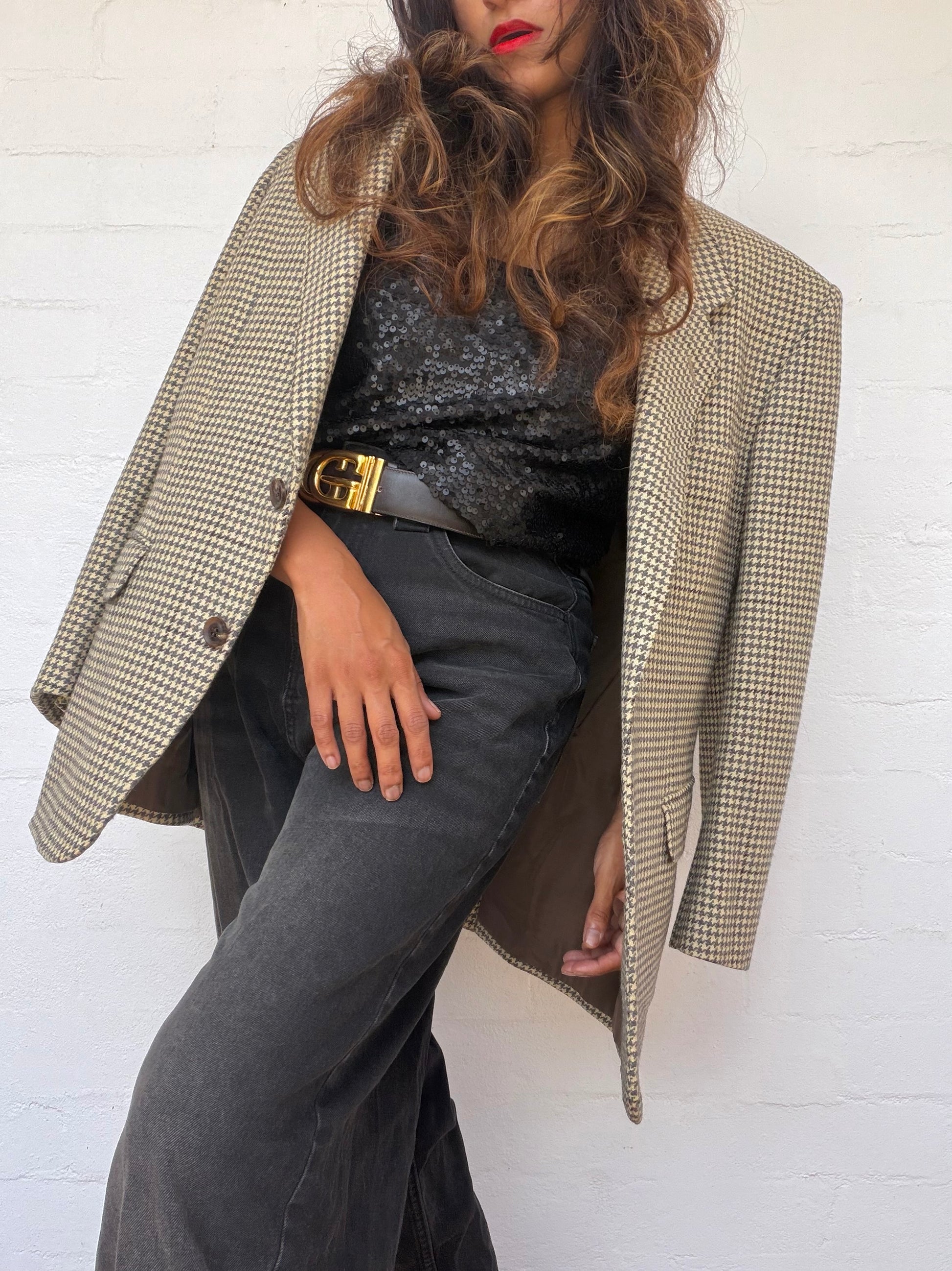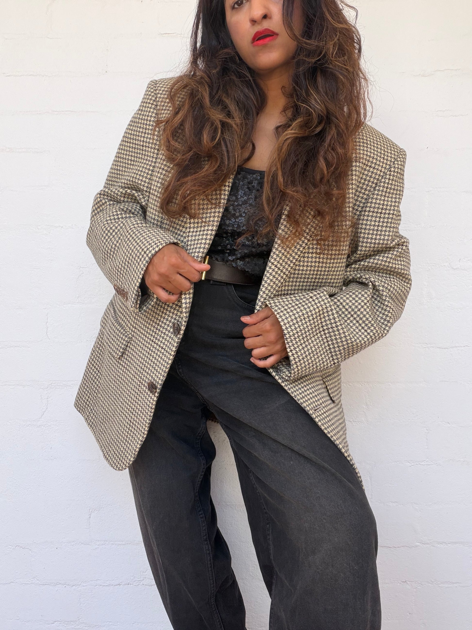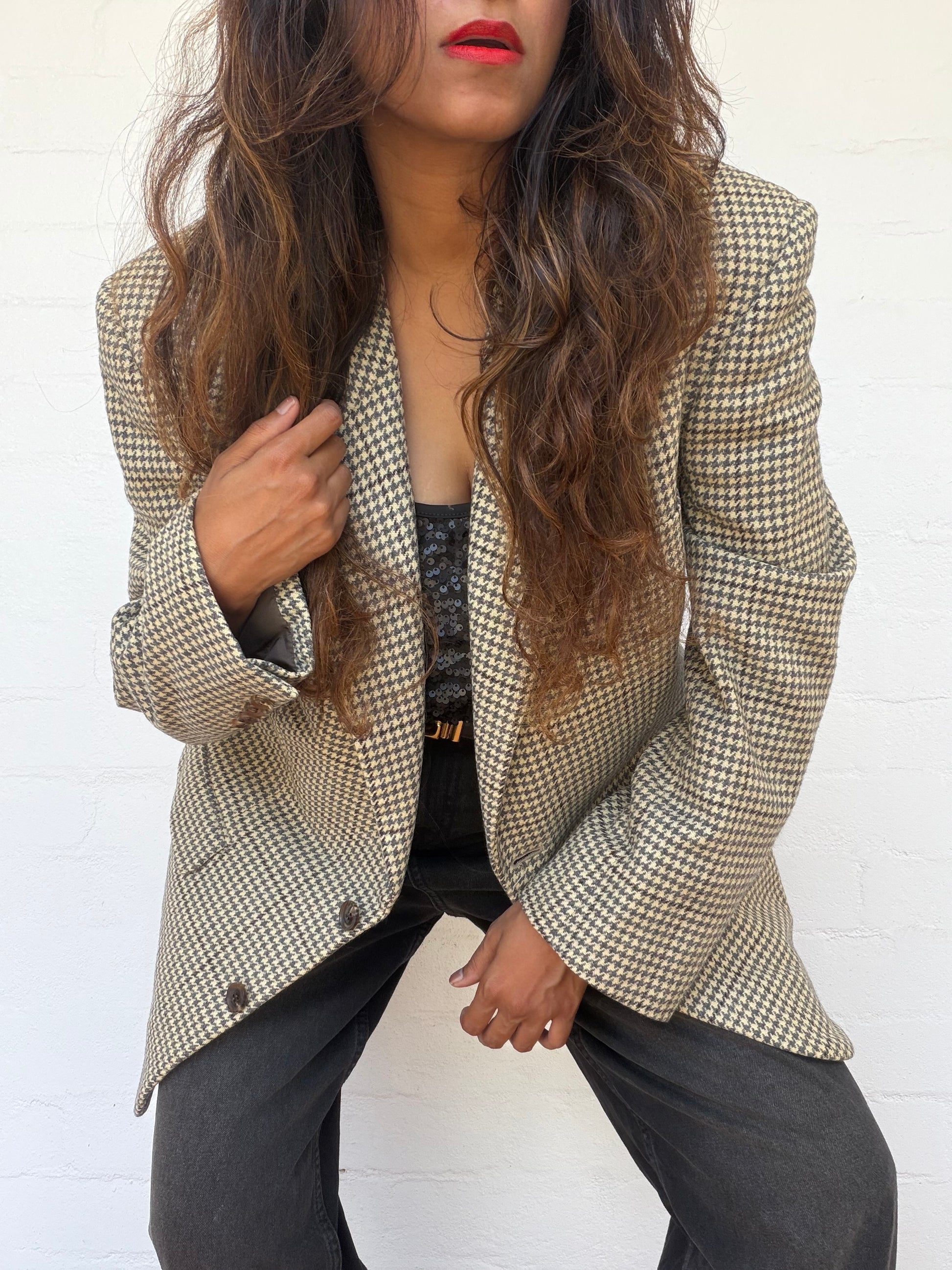 A beautifully tailored piece that combines classic patterning with effortless versatility. The timeless houndstooth design gives the jacket a refined, heritage feel, while the soft construction makes it exceptionally comfortable and easy to wear. The blazer drapes effortlessly and feels easy to wear throughout the day. Its versatile design makes it ideal for both polished occasions and relaxed styling equally striking paired with tailored trousers, denim, or layered over knitwear.
