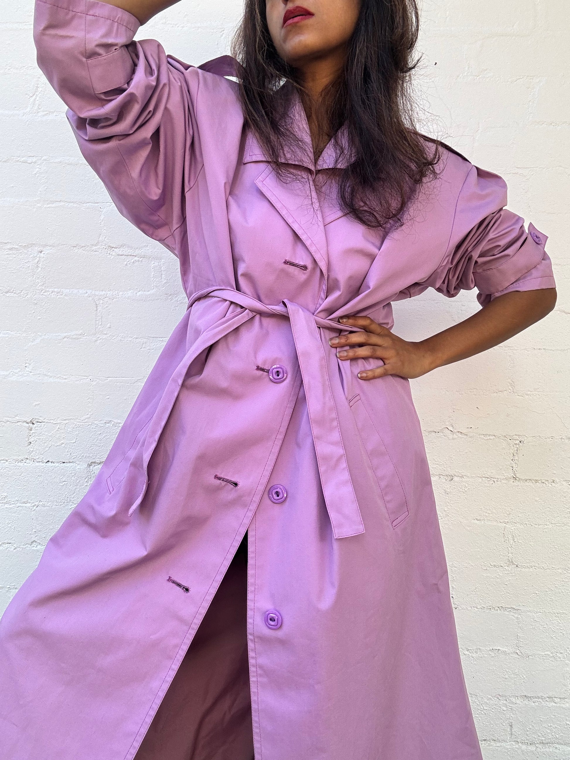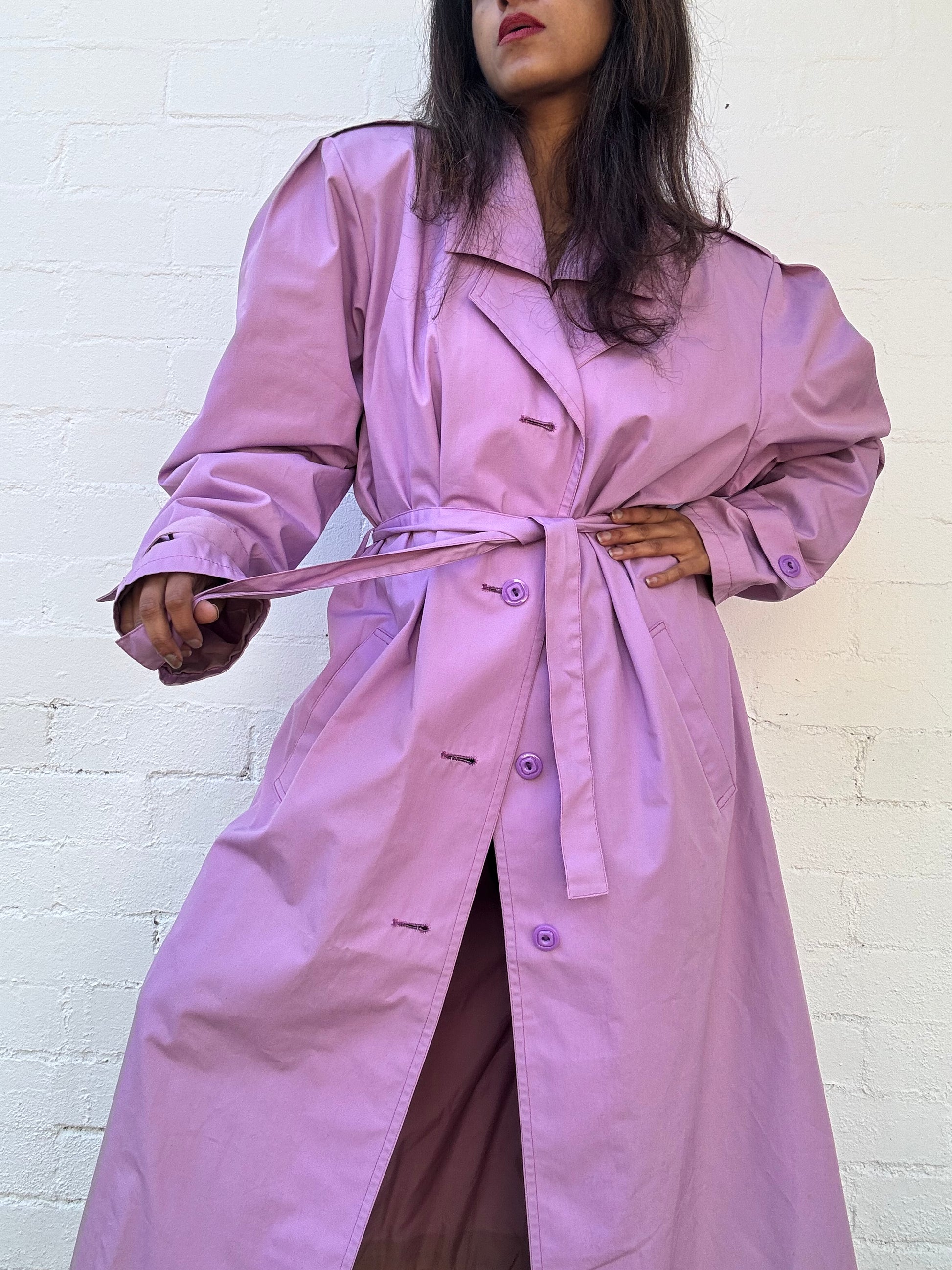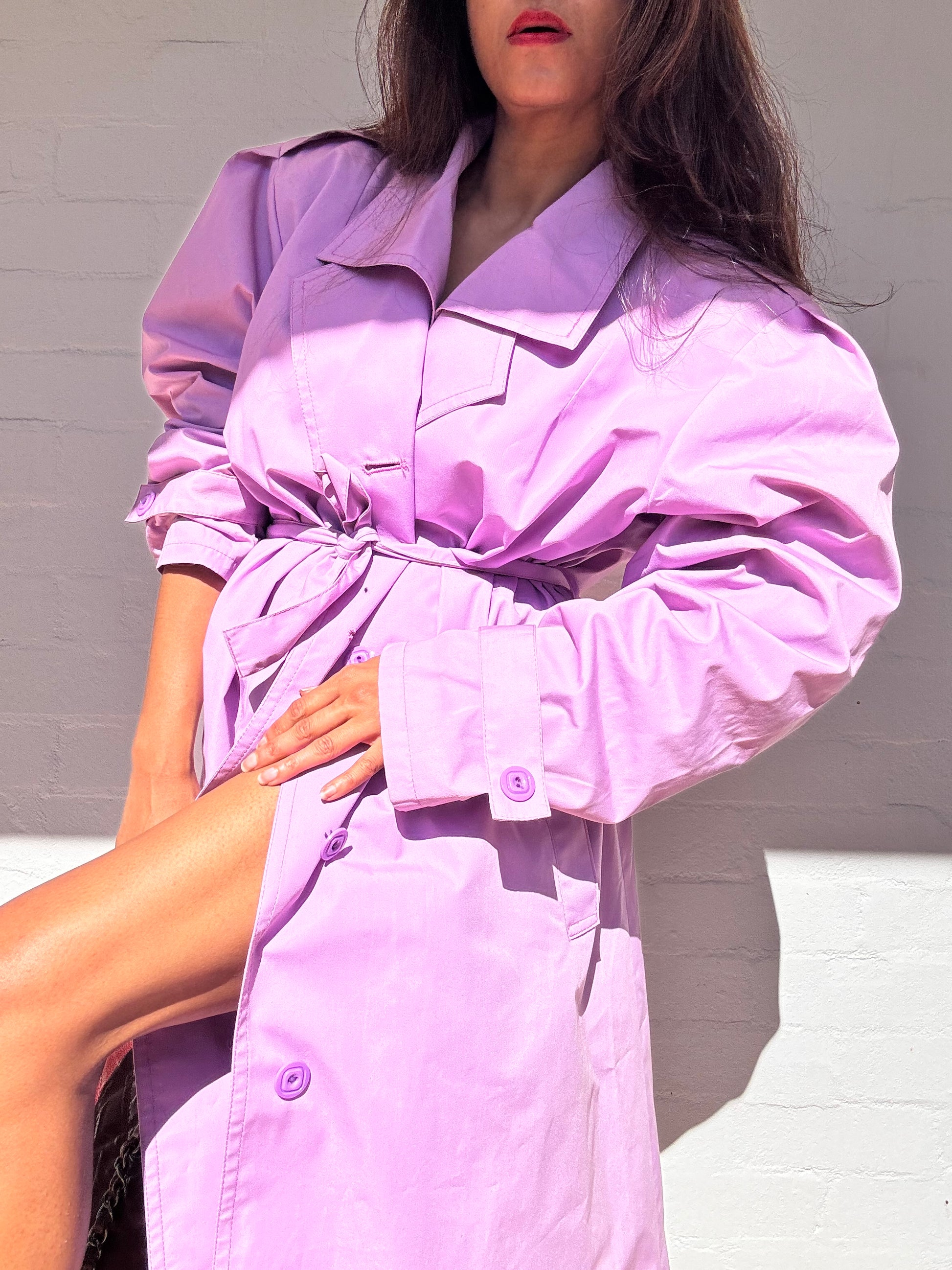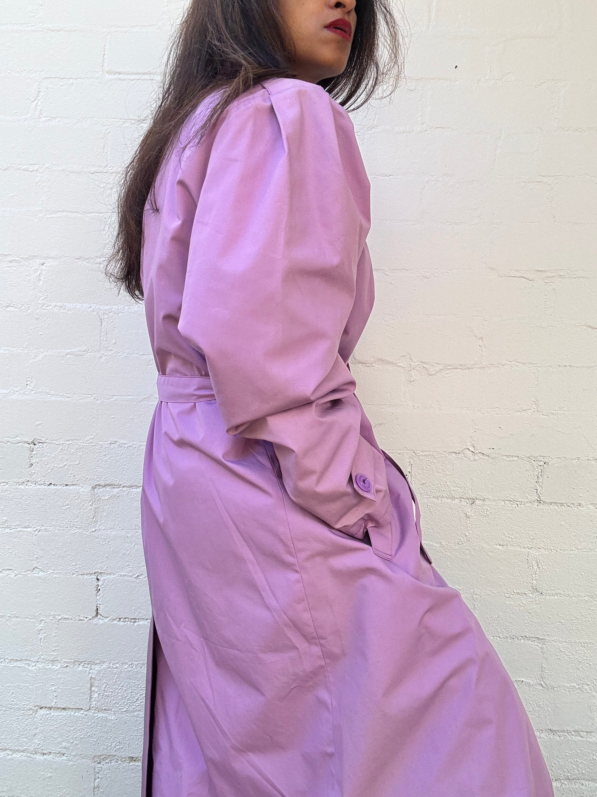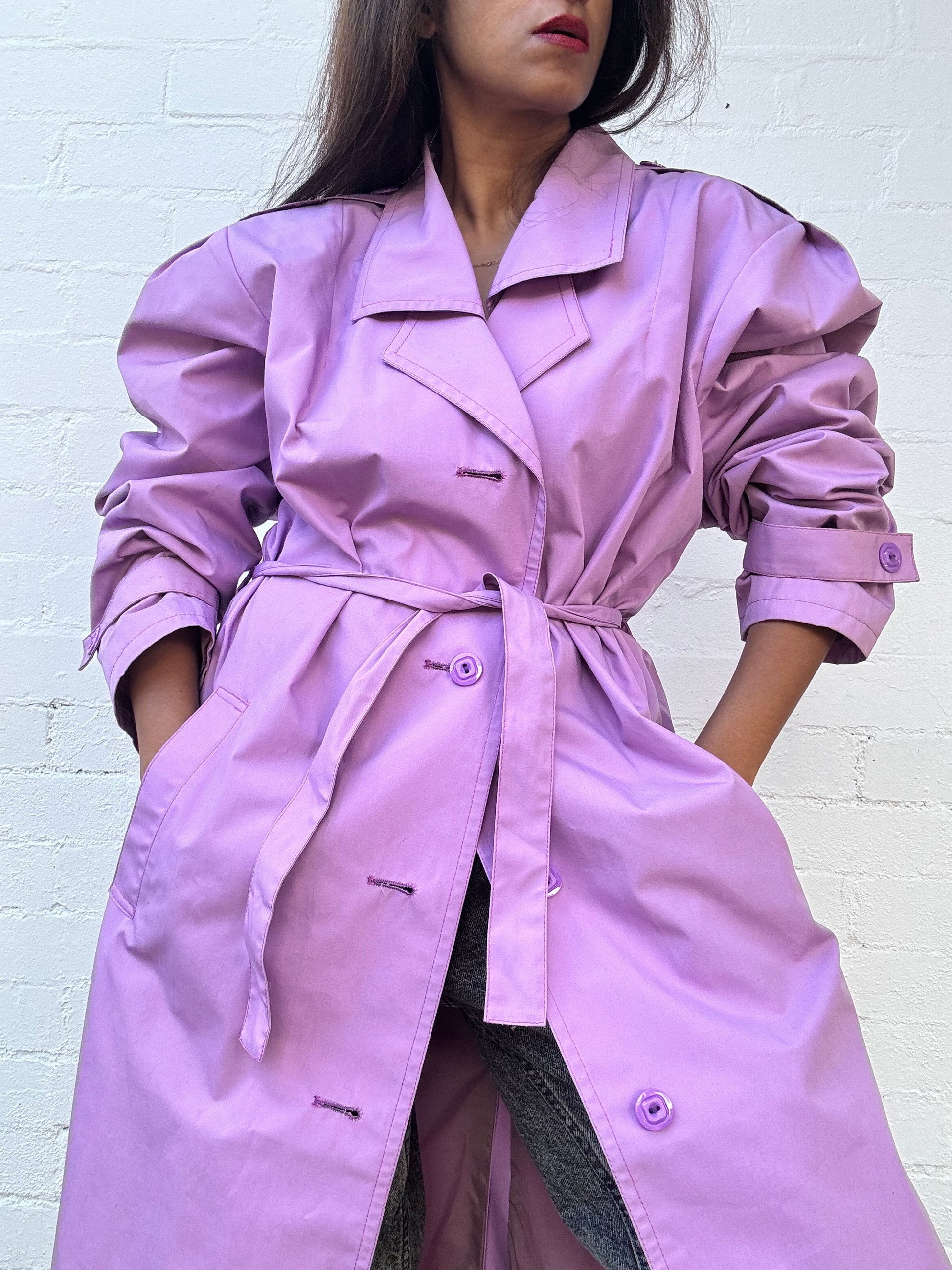 As a vintage style trench coat, this beautiful, ankle-length piece offers a stunning and unique purple hue. With padded shoulders, it provides a transcendent, elegant look for any occasion.