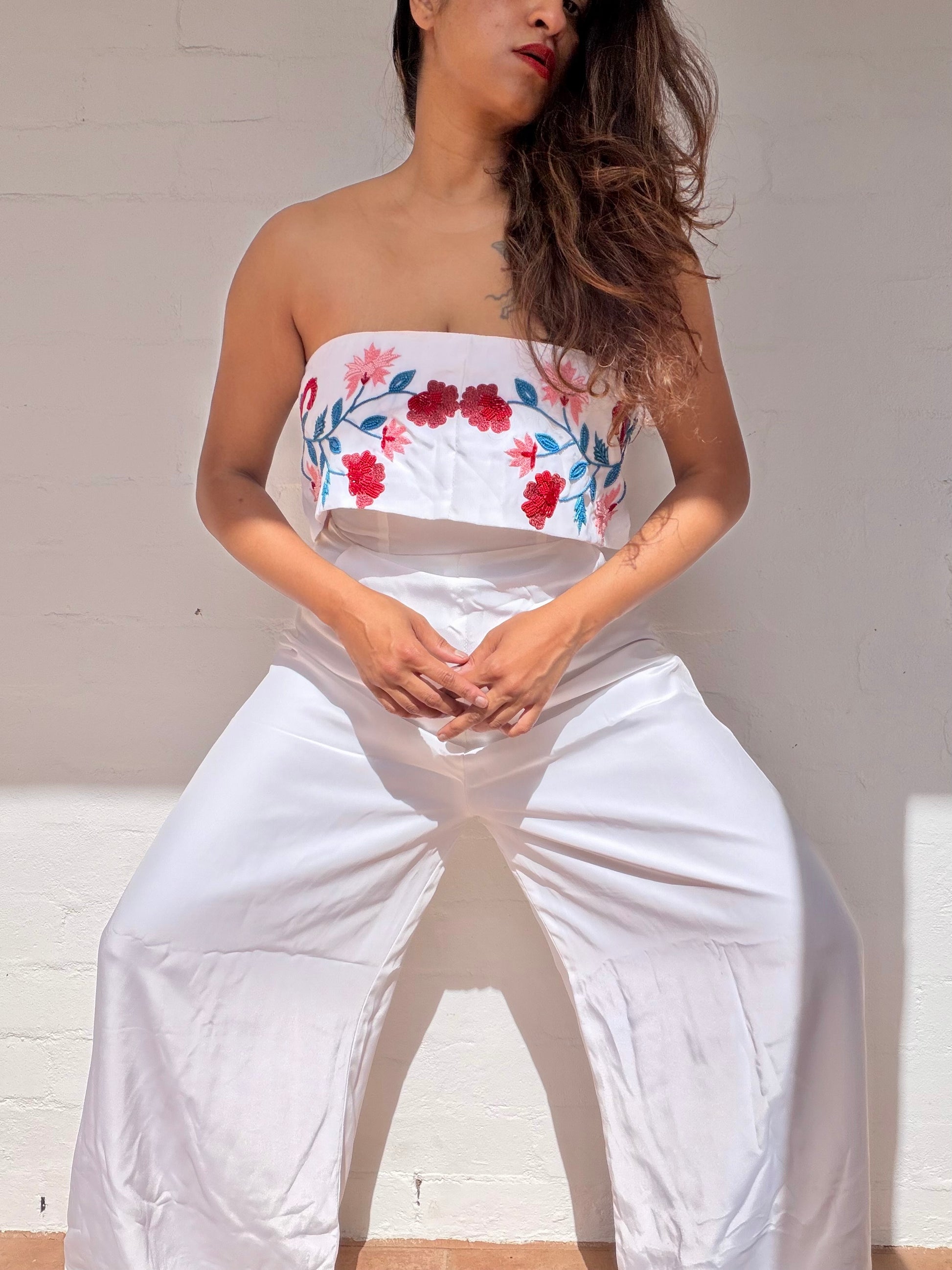 This beautiful white jumpsuit showcases exquisite hand-embroidered floral details, adding a touch of artisanal charm. Designed for both comfort and style, it’s an ideal choice for elegant gatherings or casual chic moments. Embrace effortless sophistication with this unique, handcrafted piece.